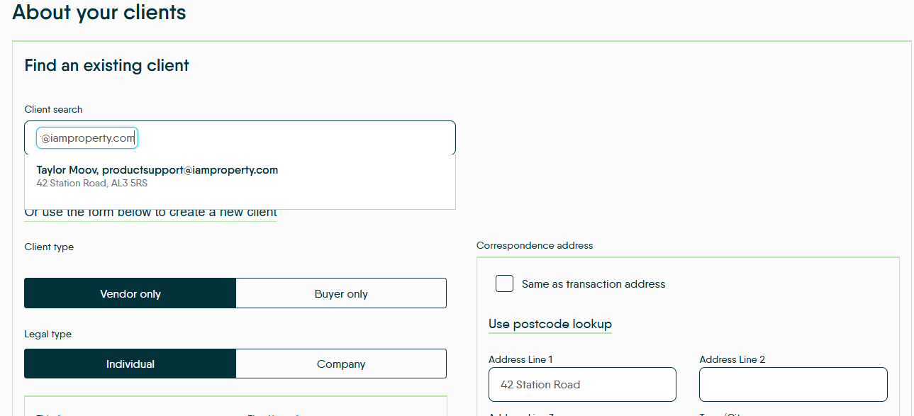 You should therefore onboard them using the "Find existing client..." search box on the 'About your clients' page. Add them to the transaction by selecting their name when it appears.