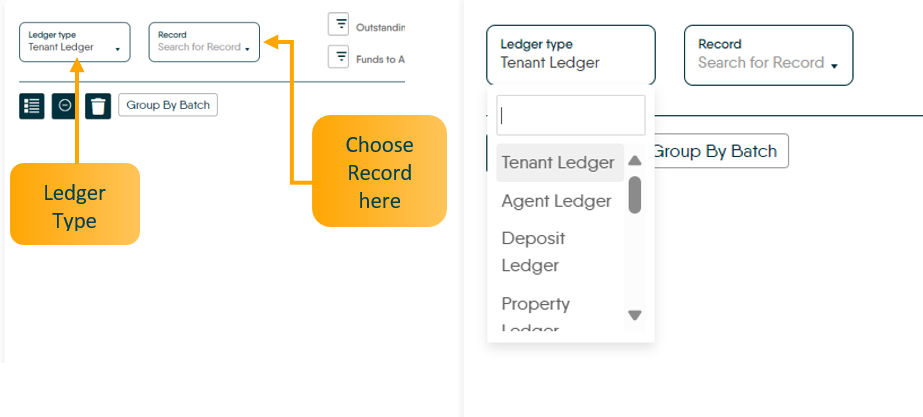 To select a Ledger click into the ‘Ledger Type’ field and select the Ledger you want, in this case ‘Tenant Ledger’. Then, in the ‘Record’ field search for the Tenant whose ledger you wish to view. When searching for the ‘Tenant’ in the ‘Select Record’ menu you are able to search by their name or by the Property address. There is an icon to the left of the Tenant name which will detail if the Tenant is Prebooked ‘PB’ , Live ‘L’ or Archived ‘A’.