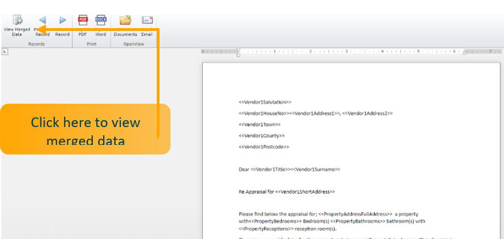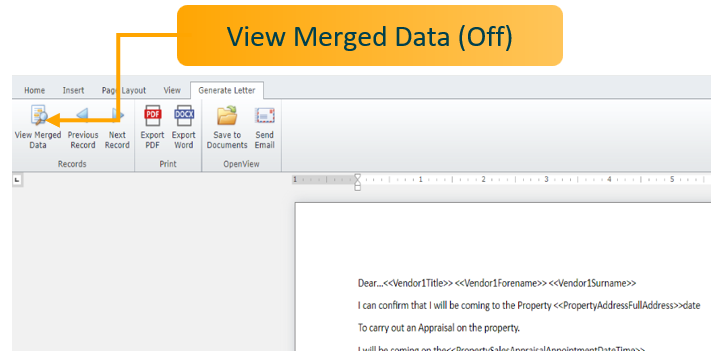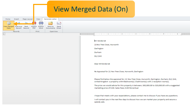 To view the letter as it will be sent, click on the ‘View Merged Data’ icon.