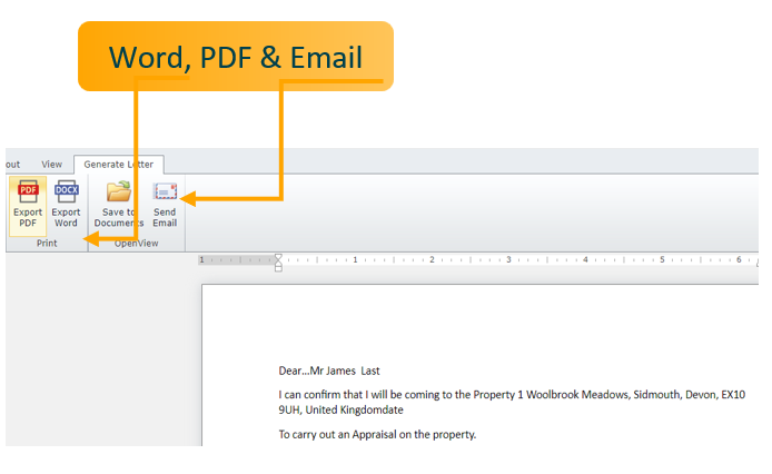 To send the letter, either export the file as a Word or PDF file., and send using your email service, alternatively, click on ‘Send Email’ this will create an email in CRM with the letter attached as a PDF either export the file as a PDF or Word document.
