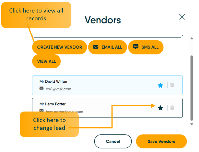 Once added, one Vendor needs to be the ‘Lead Vendor’. This is the entry with the blue star next to the name, to move the blue star just click onto the grey star next to the record you want to be the new lead. To delete a Vendor from the list, click the bin icon to the right of the entry, n.b. the Lead Vendor cannot be deleted so in this case the Lead Vendor needs to be moved.