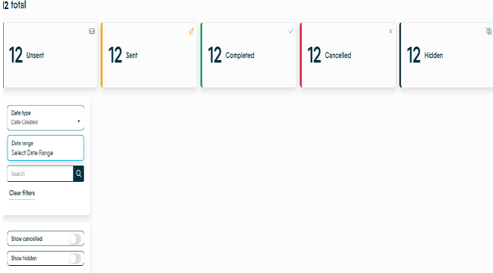 ‘Status’, (when selected) shows date created and completed, as well as whether the message has been sent and completed by the recipients/signatories.