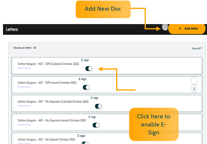 Switch the ‘E-SIGN’ toggle on for the letters which you would like to also make available as E-Sign documents.