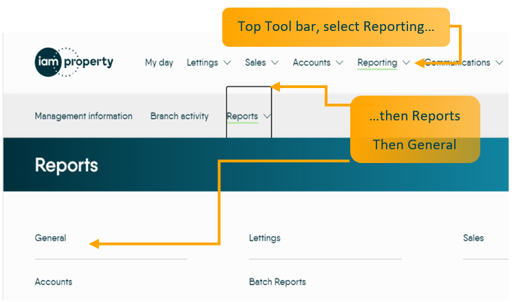To create a Calendar Day Report. From the top tool bar, select Reporting, then reports, then select ‘General’.