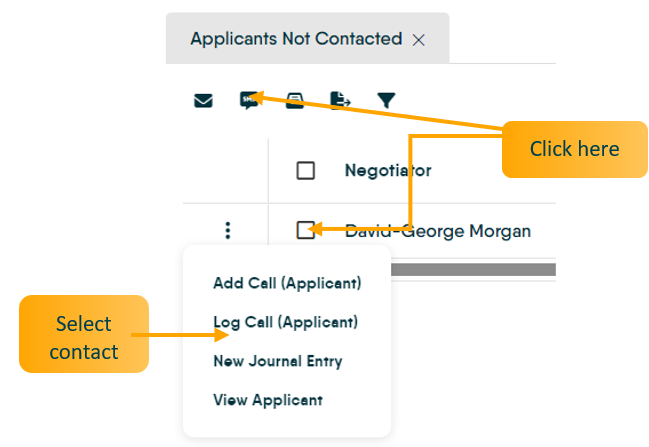 From the menu select either ‘Log Call’, ‘New Journal Entry’ or ‘View Applicant’ if you want to use SMS, Email or Letter.