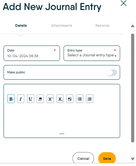 Type a description into the field, add any attachments/link any records and click ‘Save’.