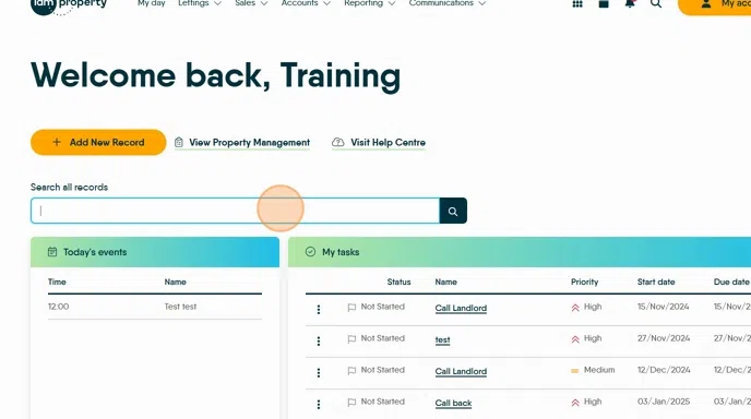 2. From the My Day Screen. Click into the 'Search all records' field and type the name of the tenant or property. Click the magnifying glass to search.