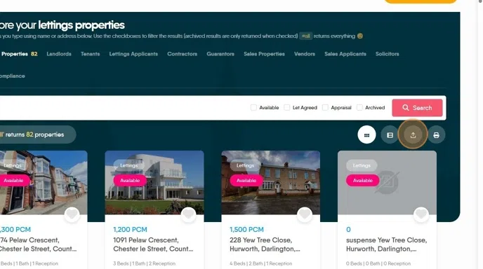 5. Once in the dashboard you can use the tiles at the top to move from this screen to view property lists, landlords etc. Each tile takes you to a list of (for example) Properties, the number shows the amount of items in the list e.g. 44 Properties.