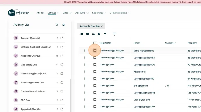 Click here. The list of activities that are currently due will show. In this case Accounts (rents) Overdue.