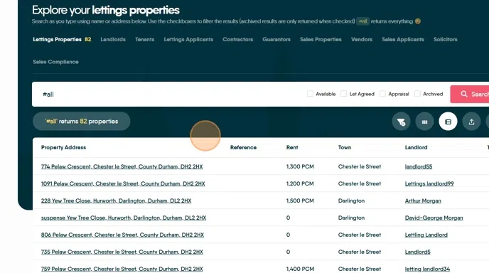 The columns can be re ordered as required. You can click onto the column title to re sort the list into ascending or descending order. The underlined information e.g. Address, Landlord, Tenant can be selected and you will be taken to the record. Allowing for easy navigation around the CRM and easy to find the correct information quickly.