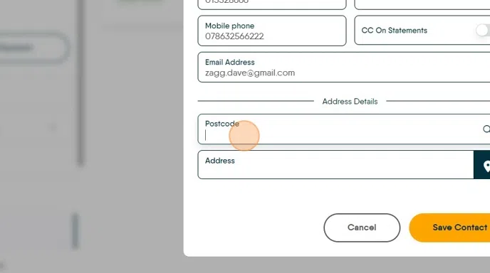 14. Click this text field. Type the Postcode and click the search icon, select the address from the list and edit if required.