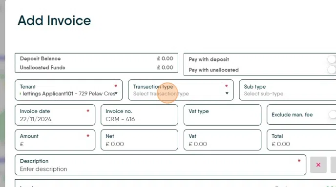 Click "Deposit Invoice" This will complete all the amount fields with the information set when the prebooked tenancy was created i.e. the current rent as shown on the Tenant record.