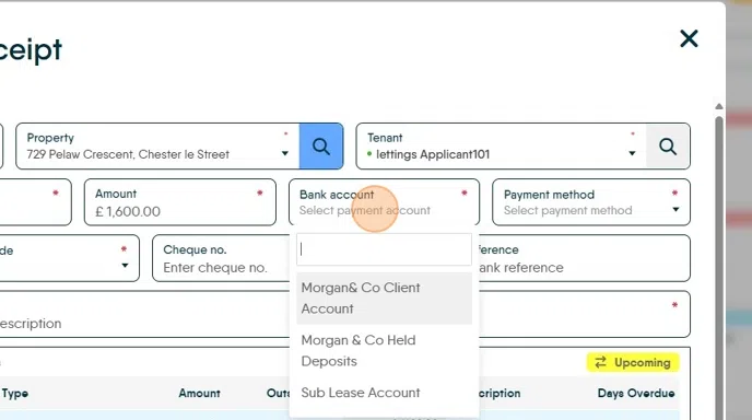 15. Click "Select payment account" (the account the payment came into) and "Select payment method" (how the payment was made) set as appropriate