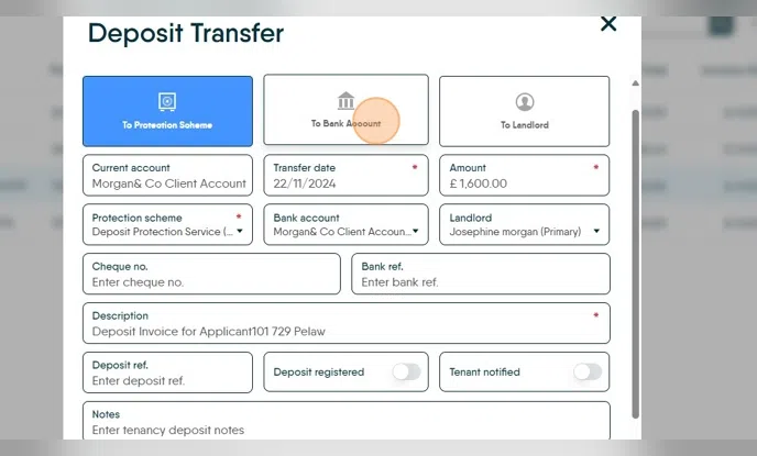 25. Click "To Landlord" if you are transferring the Deposit to a Landlord. Ensure the Landlord details are correct, the description is accurate.