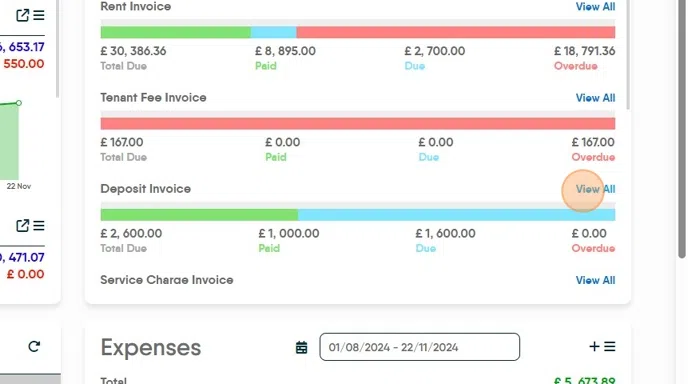 9. The deposit invoice will now show as "Due" in the Deposit Invoices section of the Invoices tile. Click "View All" to see all the currently Due and Overdue (uncollected) deposit invoices.