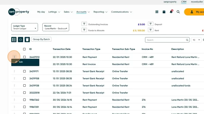 If you have not selected the option to use Unallocated funds (as shown previously) then you can allocate the funds here by clicking the 3 dot menu to the left of the Tenant Bank Receipt line and selecting 'Allocate' this will show all the outstanding invoices, select the rent refund invoice you have just created.