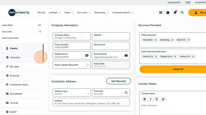 12. Click "Checklist". If enabled this will show the checklist for a Contractor record.