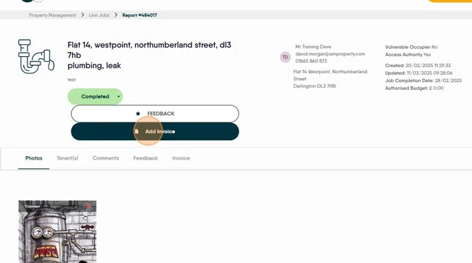 23. Click "Add Invoice" adding the invoice allows the job to be immediately chargeable to the Landlord.