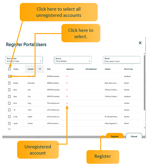 Then select the ‘Register Portal Users’ option. This will show a list of all the Landlords/Tenants and Vendors currently registered (green tick) and unregistered (red X) to use the Client Portals.