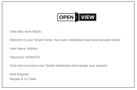The User will receive an email similar to this, personalised to the Agency sending the message. This message provides the username and password for the User to use, as well as a link to the User (Vendor, Tenant, Landlord) dashboard.