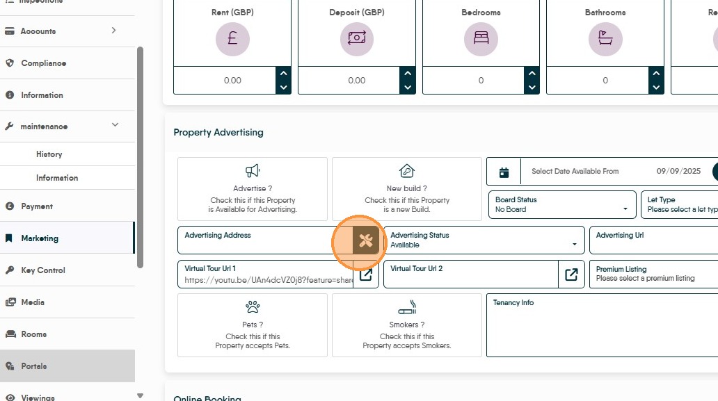 4. Go to the property's Marketing tab, and click the auto-fill button next to the Advertising Address