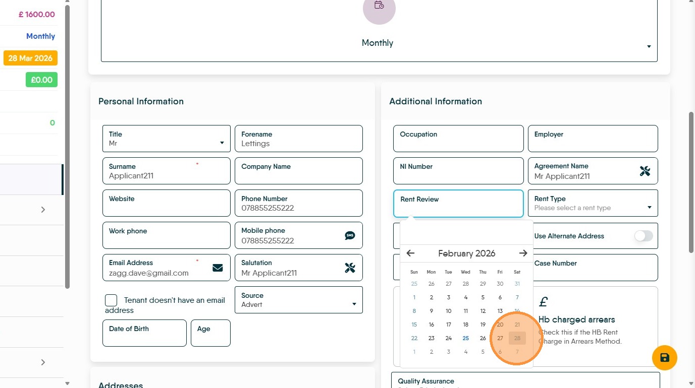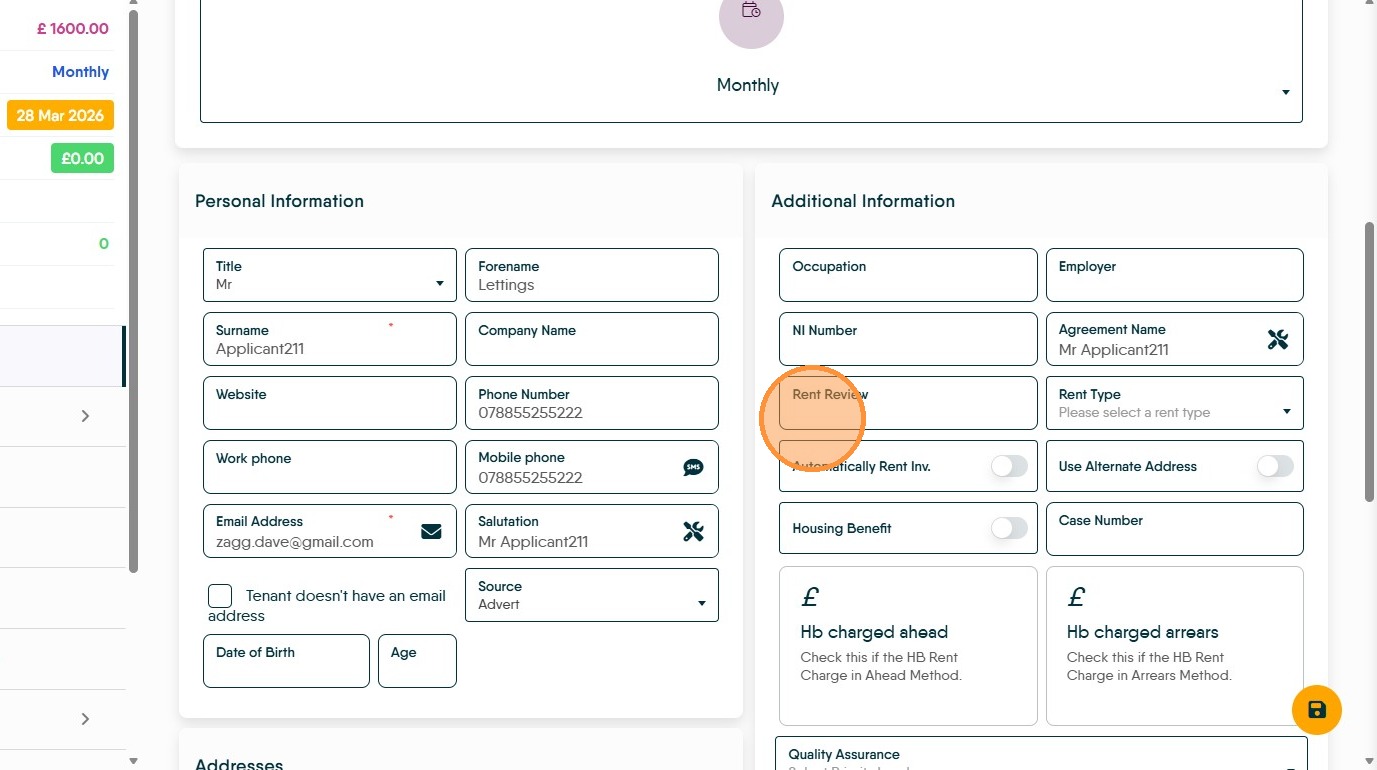Once the tenancy has been added you can add a rent review date onto the primary tenant in the 'Additional Information' section on the tenants details tab – this would be 12 months after the tenancy start date. To learn how to add a Rent Review date [Add Rent Review Date]