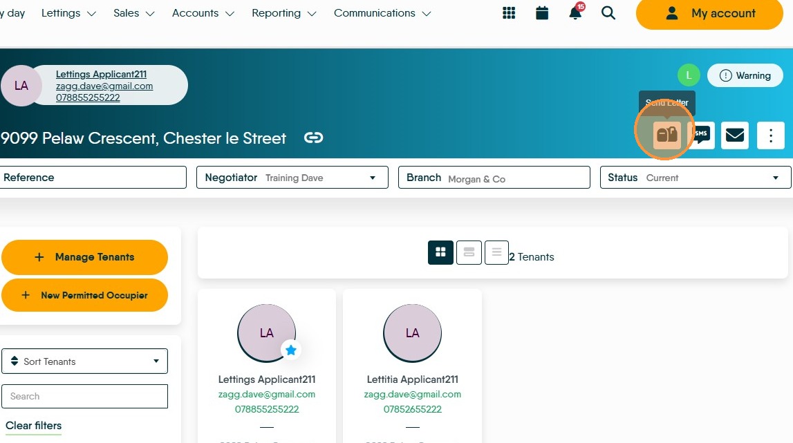 13. From the Tenancy record, click the 'Send Letter' icon.