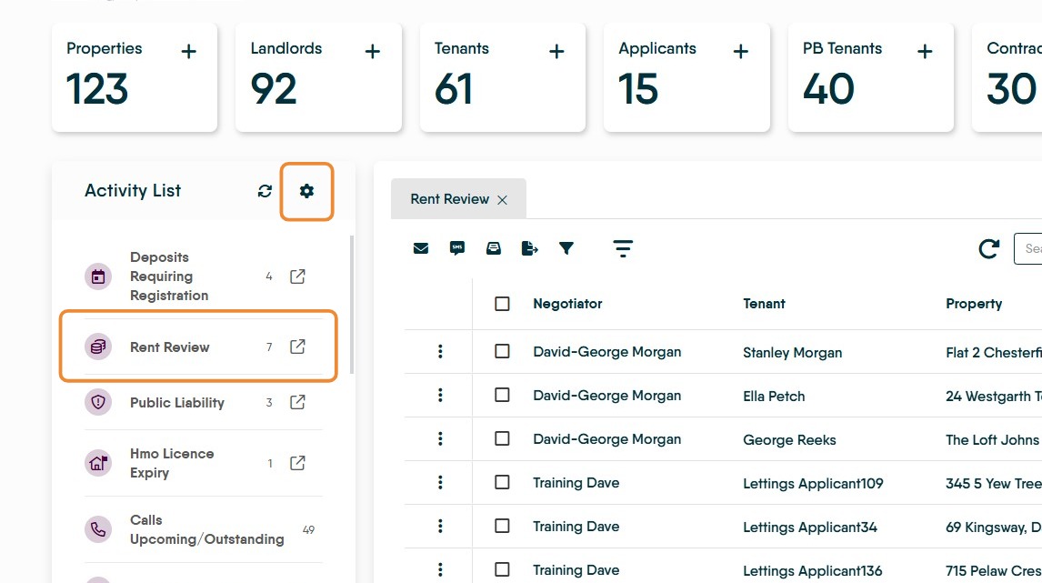 Using the activity list to track the Rent Review dates you have set. On the lettings dashboard set rent review to notify of upcoming reviews due, we suggest 90 days. To learn How to use the Activity List [Configure Activity List]