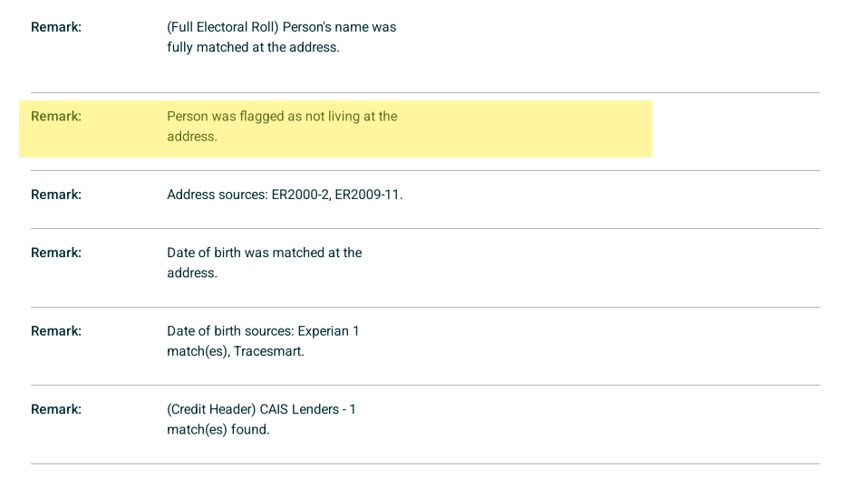 This result usually indicates that the individual has moved address and the electoral register has not yet been updated, or the update has not fully propagated across our supplier data sources. In most cases, this result will appear alongside an electoral register match, as the individual may technically still be listed at the address.