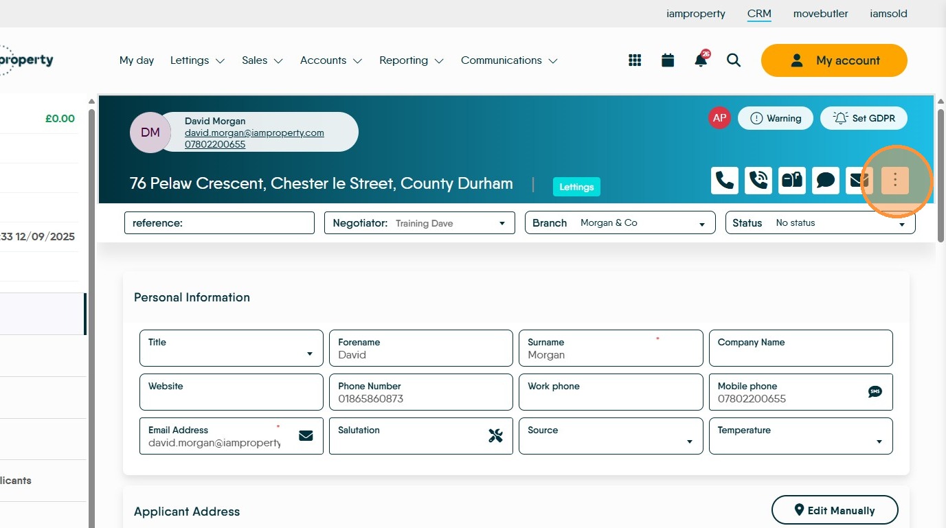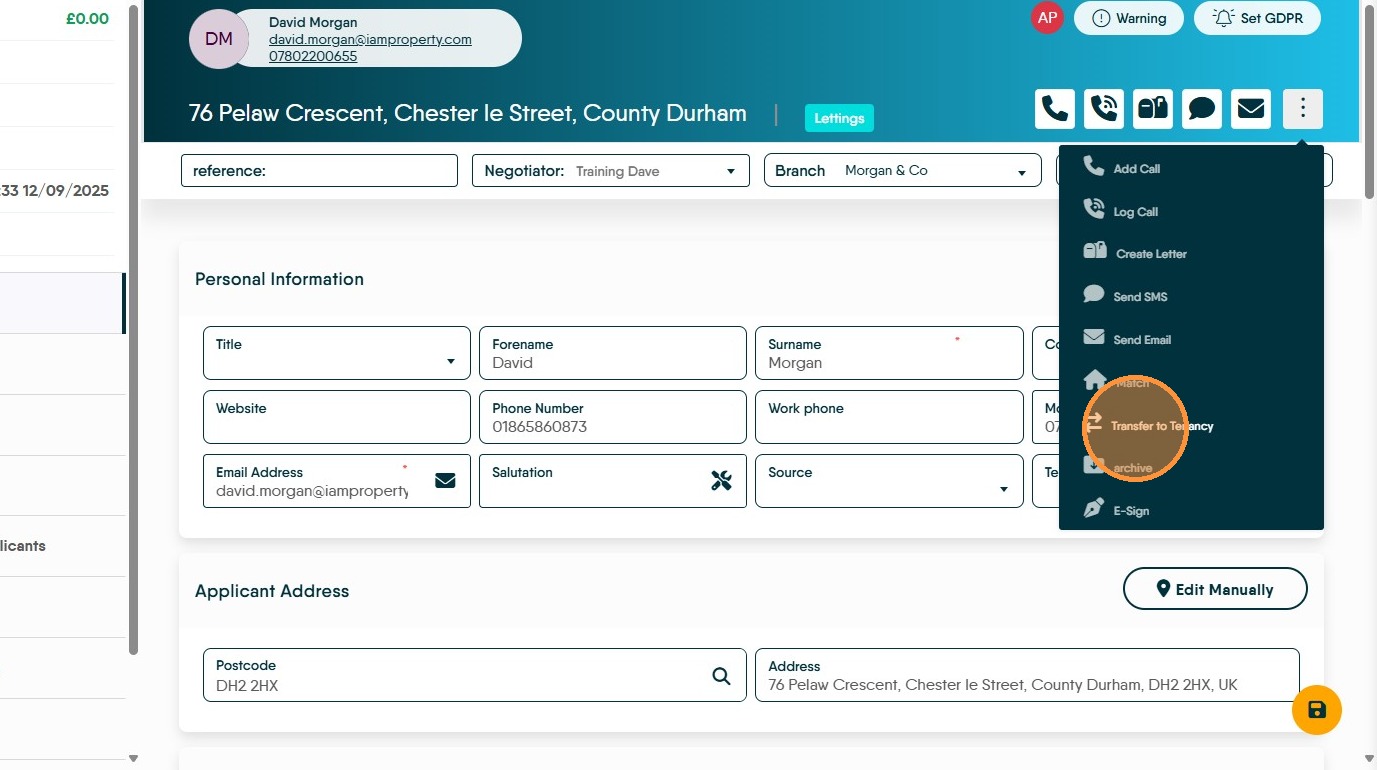 1. This process of creating a new tenancy can be started from 2 places in the CRM. Either the Applicant record or the Property Record. This guide will look at creating the Tenancy from the Applicant Record.