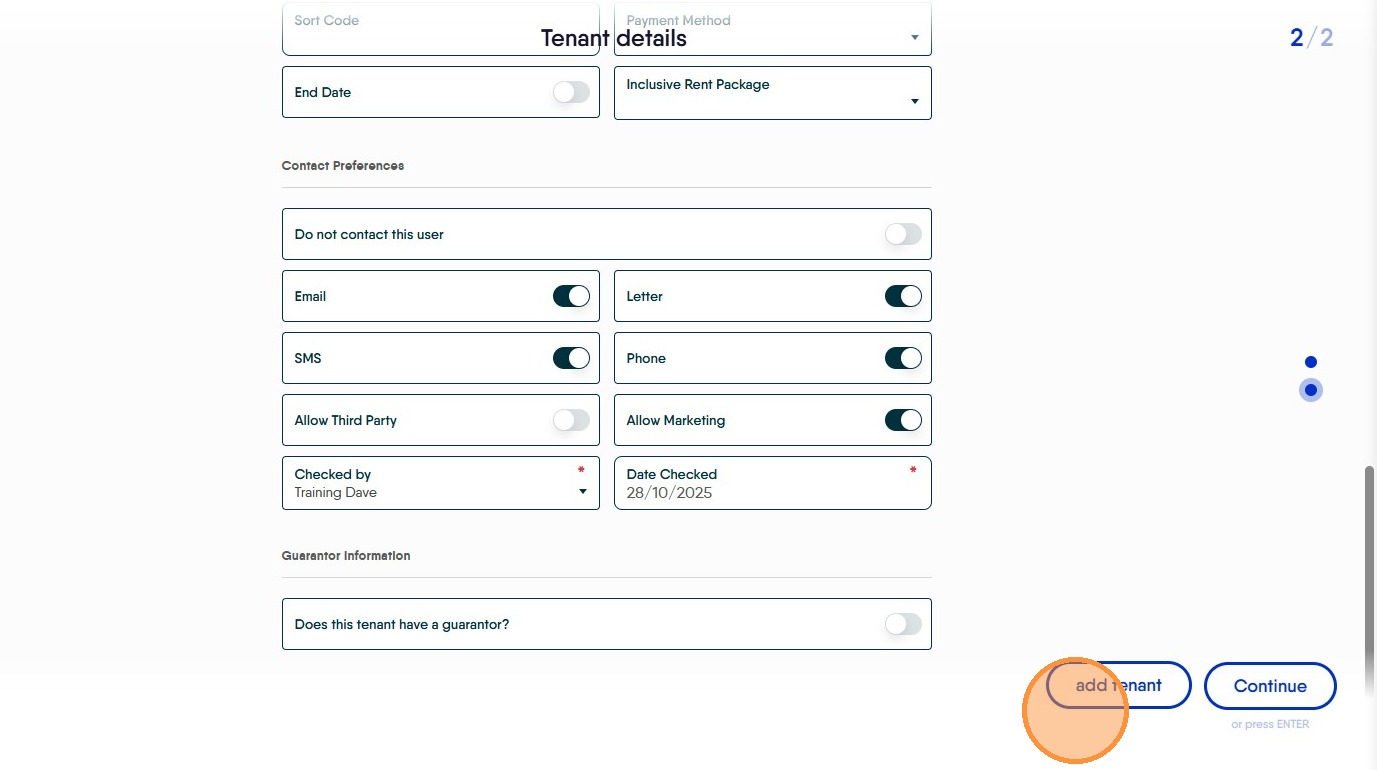 18. If a second, or subsequent, tenant is to be added. Click "add tenant" add the tenant details, the screen is similar to the previous screens for the lead tenant.