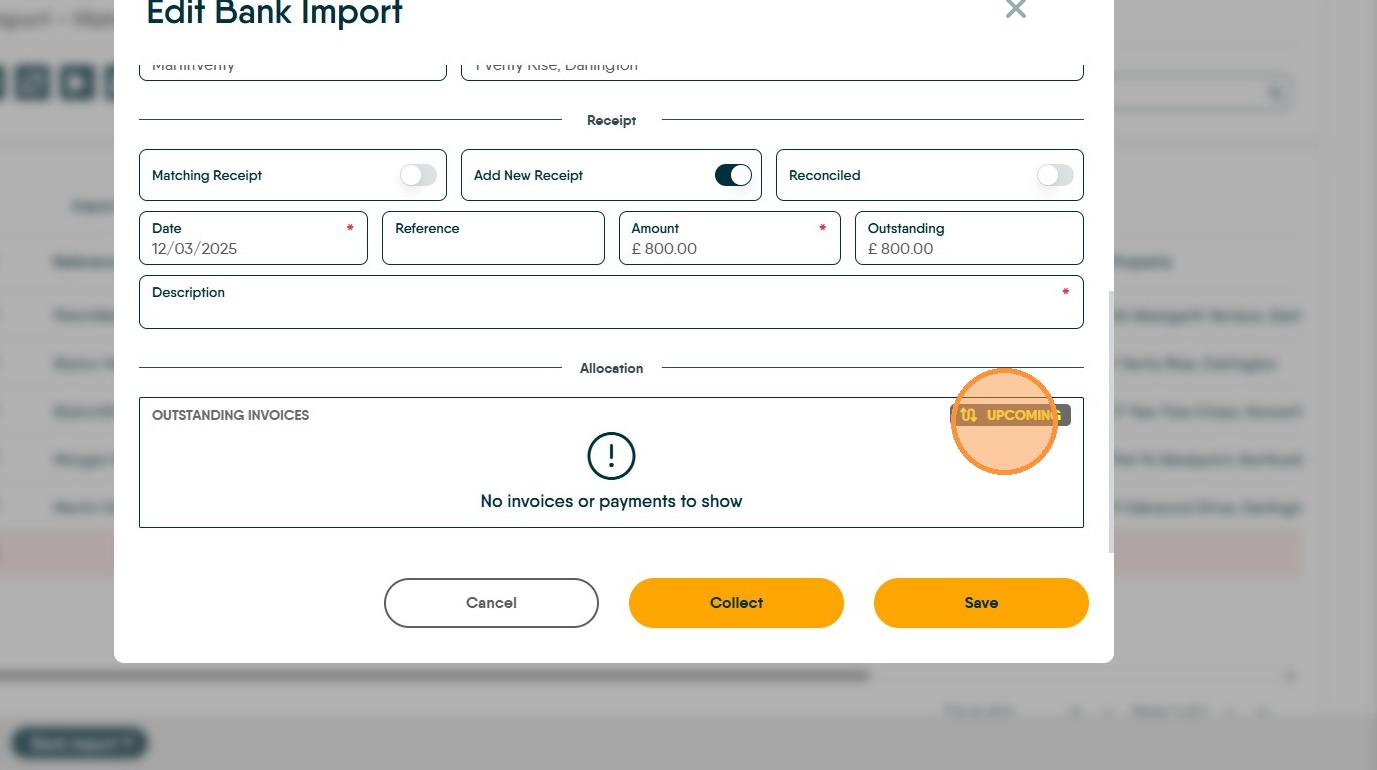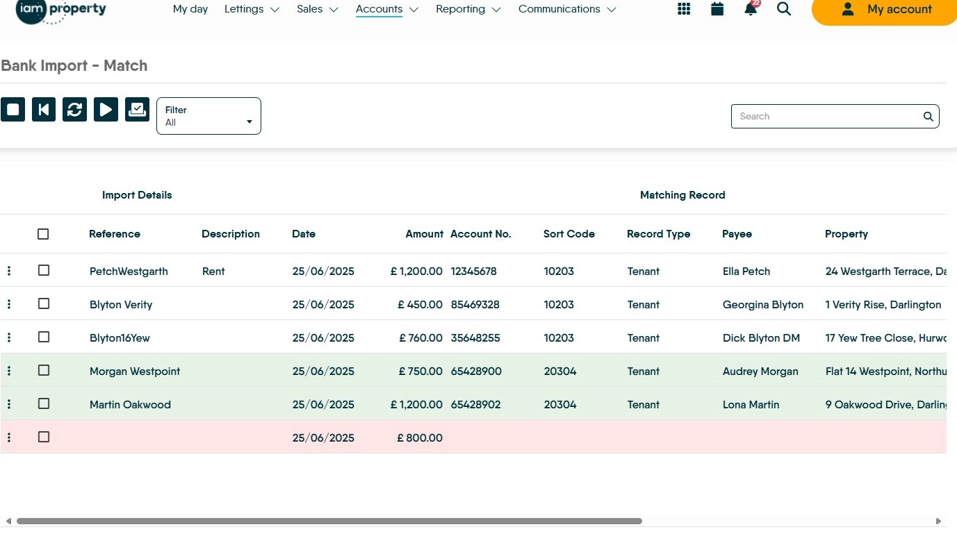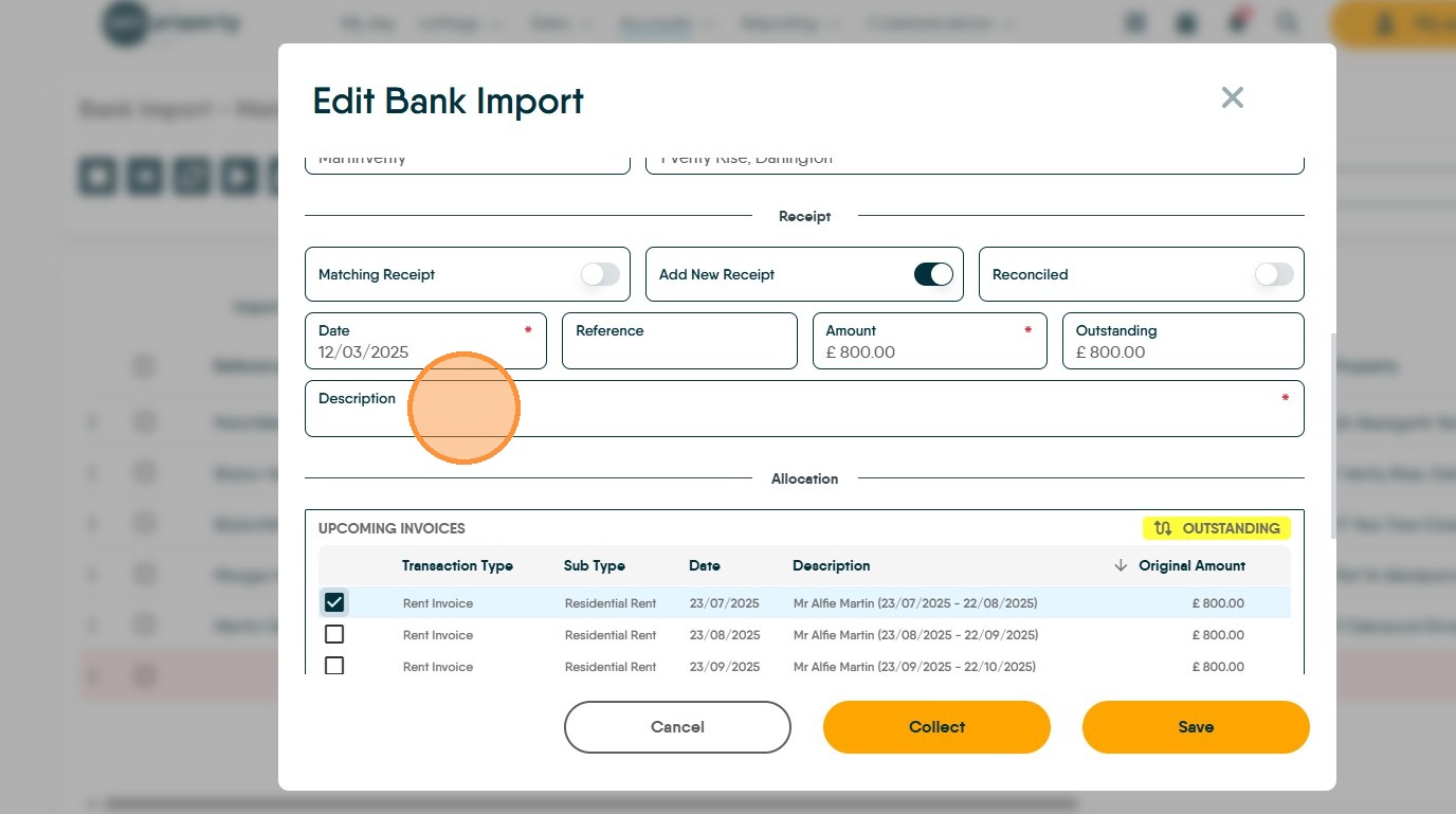 18. Click into the Import screen and using the information that you have in CRM etc. and try to work out who/what the payment is for. If there is a reference or description as part of the import this may help. For example, you can use the 'Rent' screen in the accounts dashboard to see who has (in this case) £800 invoice outstanding and work out from there who it may be.