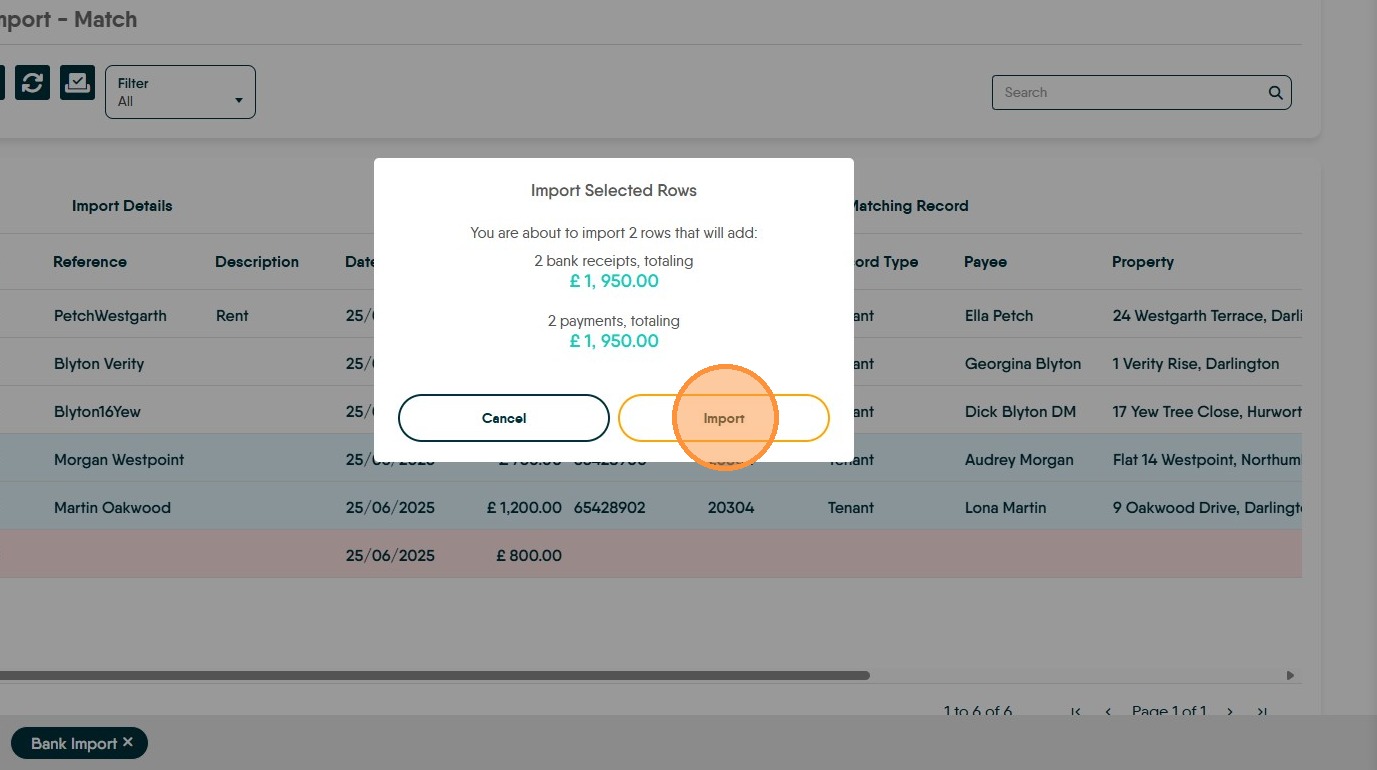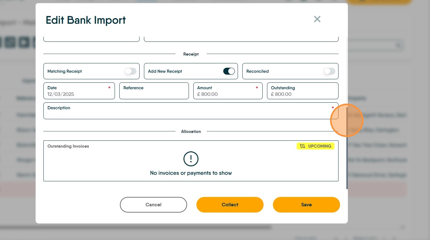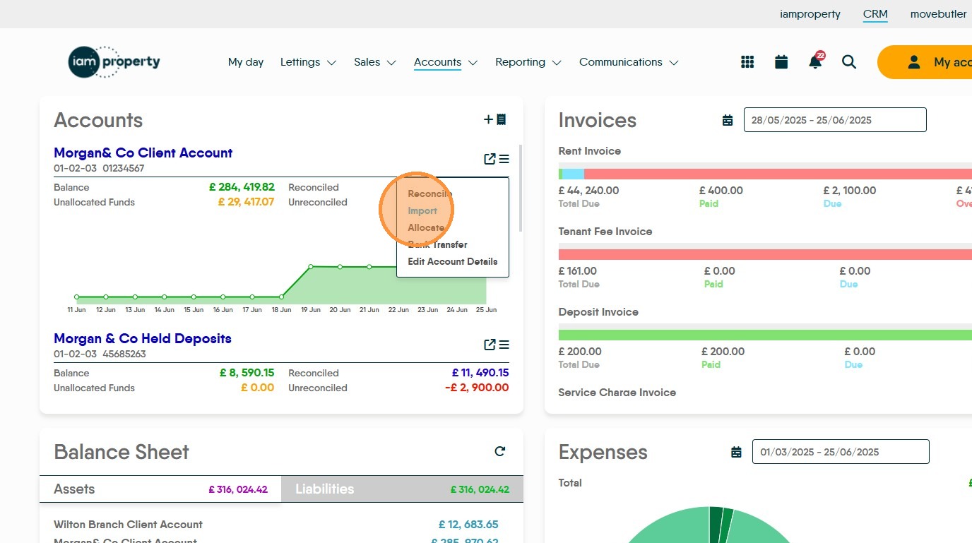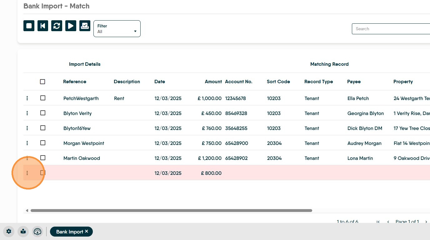18. Click into the Import screen and using the information that you have in CRM etc. and try to work out who/what the payment is for. If there is a reference or description as part of the import this may help. For example, you can use the 'Rent' screen in the accounts dashboard to see who has (in this case) £800 invoice outstanding and work out from there who it may be.