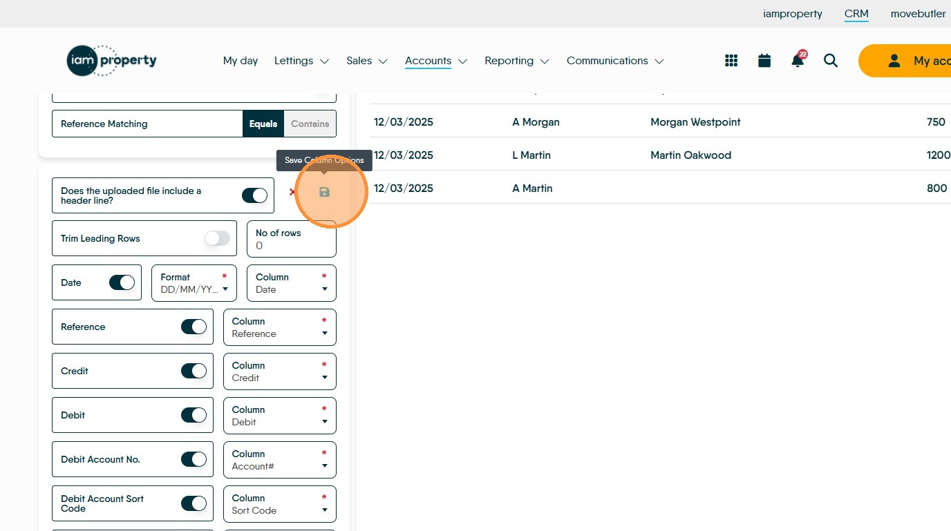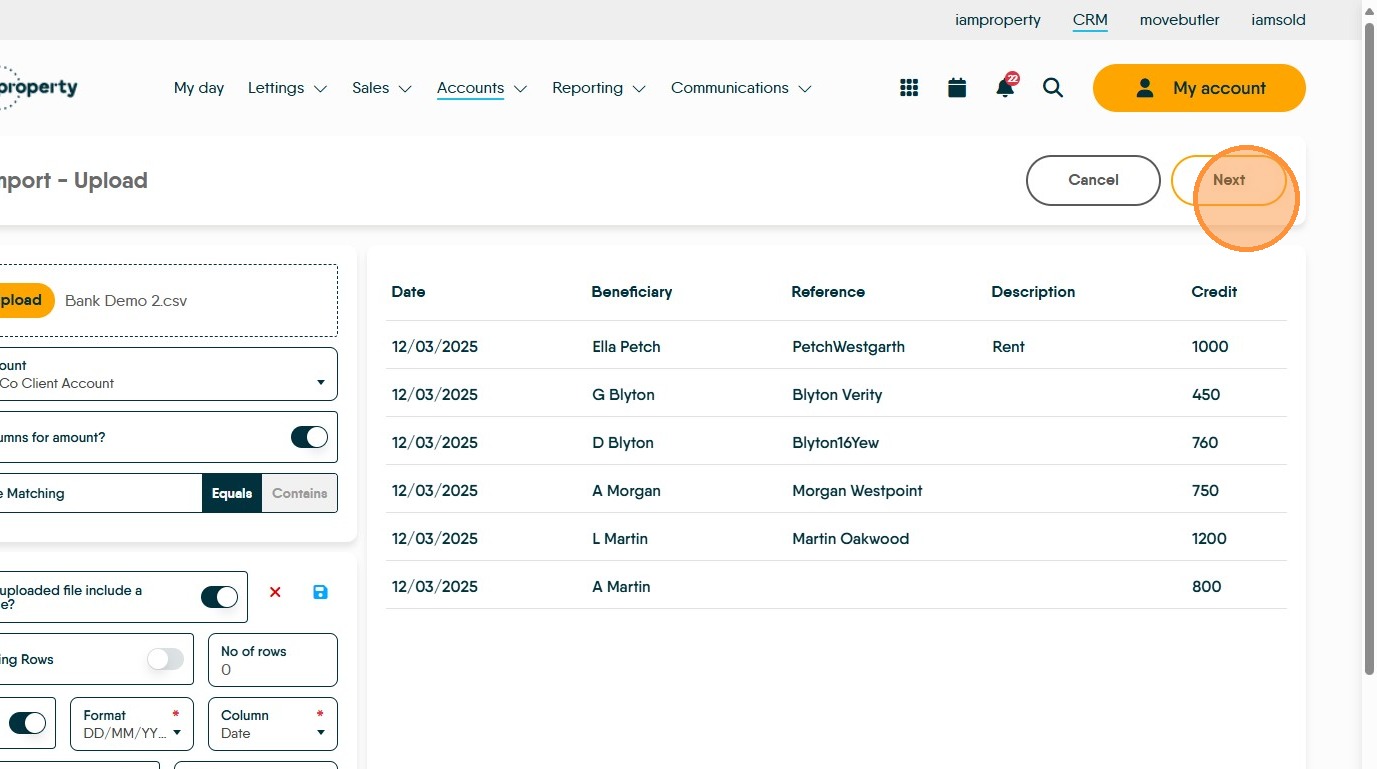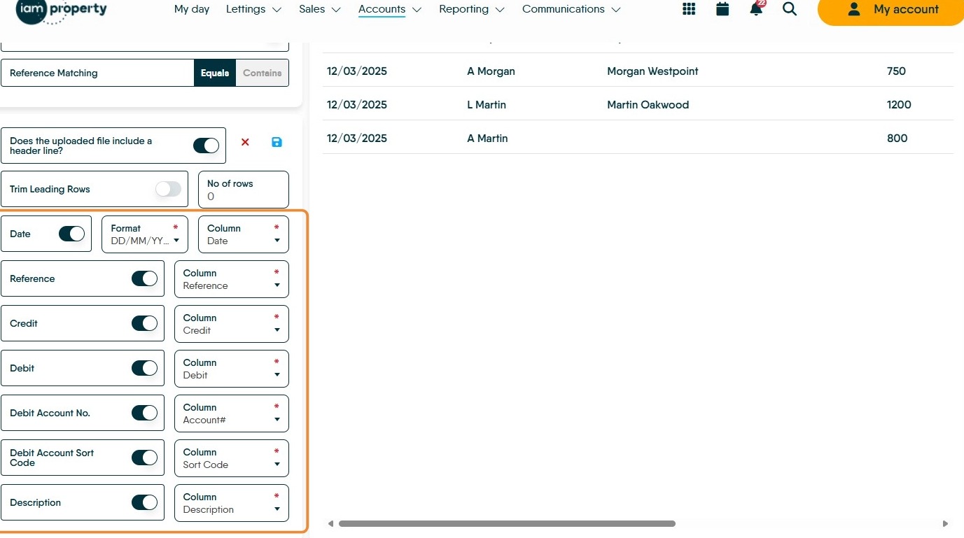 If your bank statement shows Credits and Debits, select the 'Use 2 Columns for amount' option to show both of these. Leave 'Reference Matching' on the (pre selected) Equals option as this is the most accurate process to match the Tenants Payment references to their rent invoices.