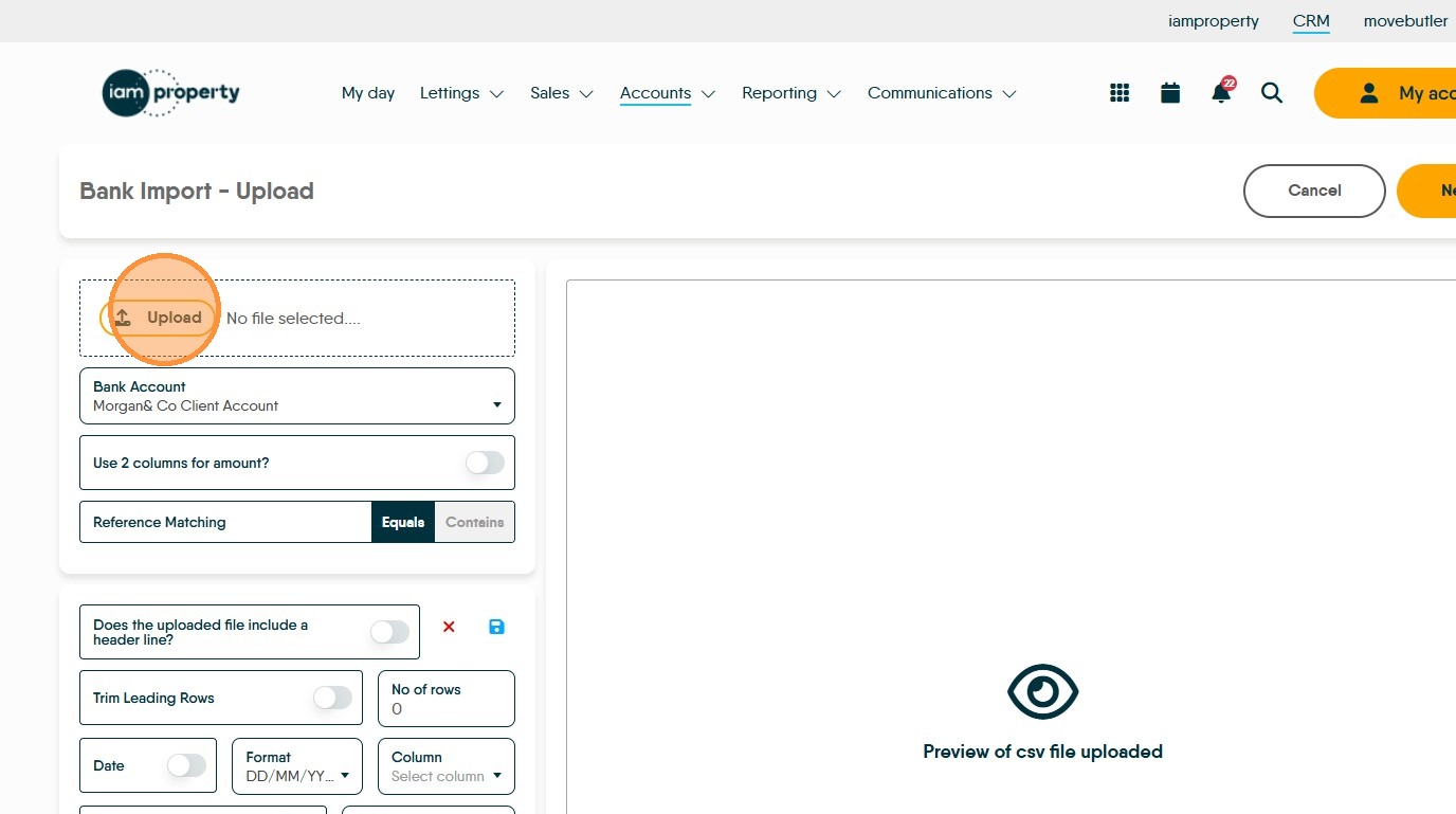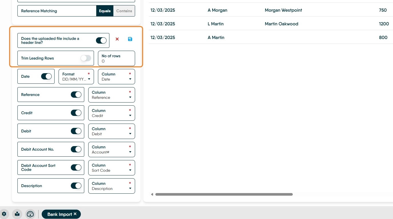 This first section tells the CRM if your Bank statement includes any header line and/or any leading rows. e.g. Name, Account Number etc.