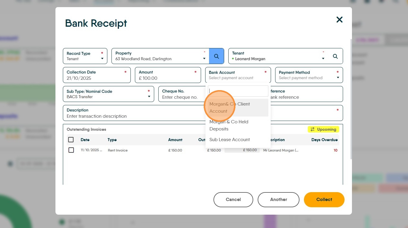 9. Click the name of the account that the money was paid into, usually your main client account. In this example it is shown as "Morgan& Co Client Account"