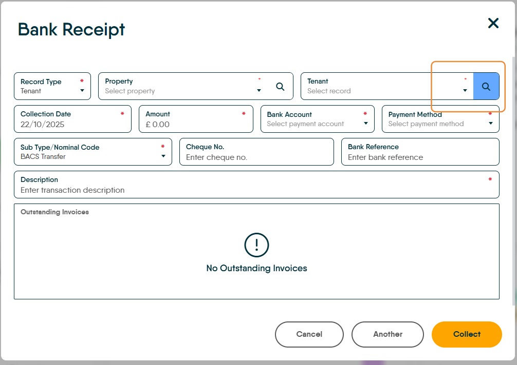 Tip: Tip! You can also search by Tenant rather than Property. To do this click the magnifying glass icon to the right of the Tenant field so it turns blue.