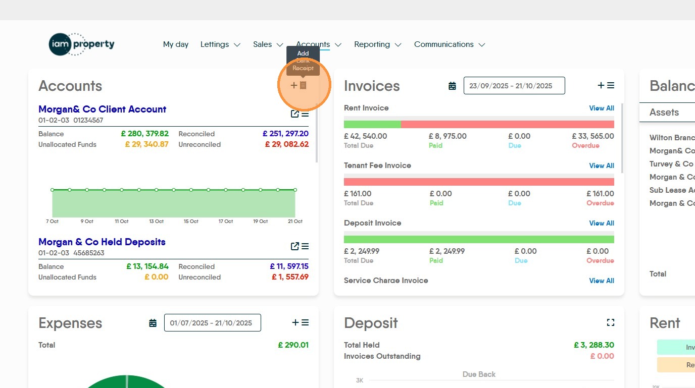 14. If you selected a Deposit invoice the funds will now show in the deposit tile in the accounts dashboard. They will still need to be transferred to the deposits protection scheme you are using.