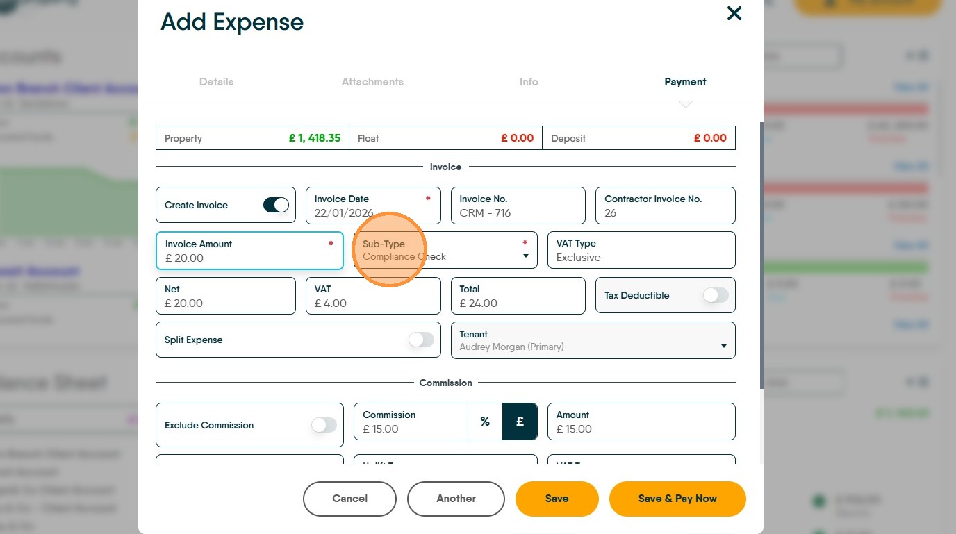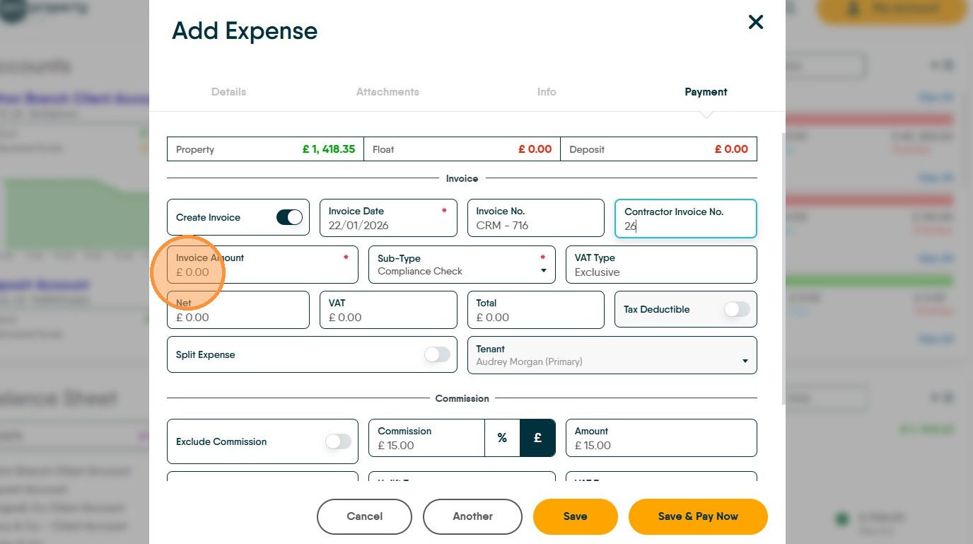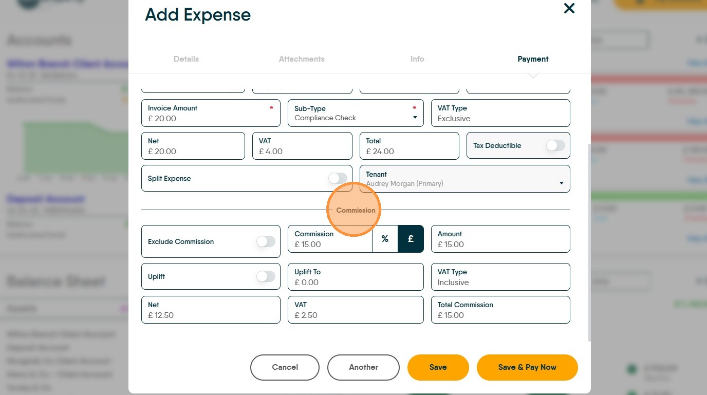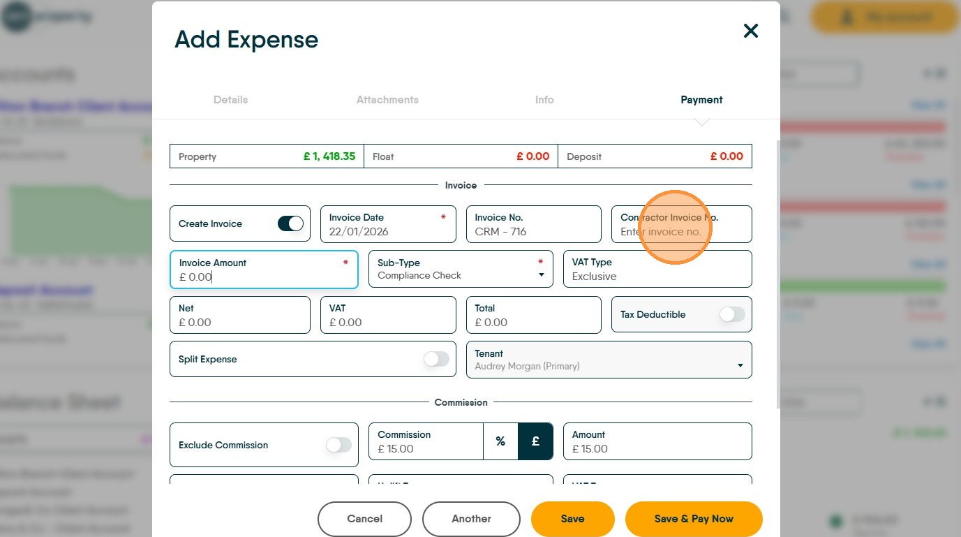 29. If you charge a commission to contractors for giving them work or you charge an uplift to Landlords, this is where that is added. Commission is added to the contractor record, in the Financial tabs. Click "Commission" to charge.