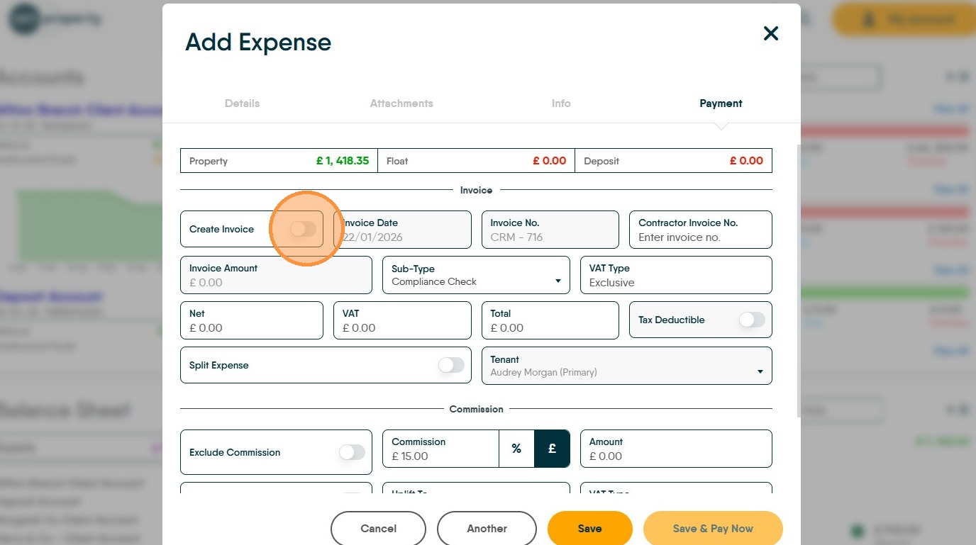 24. Click here to create the charge to the Landlord. Check the invoice date and the invoice number are correct. The 'Invoice Number' is created from the configuration and increases by 1 each time.