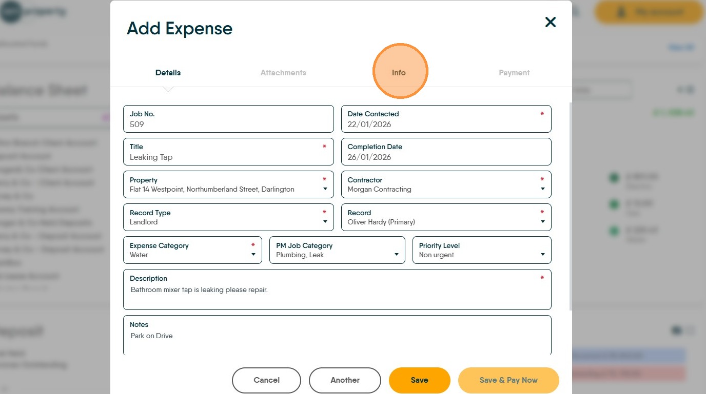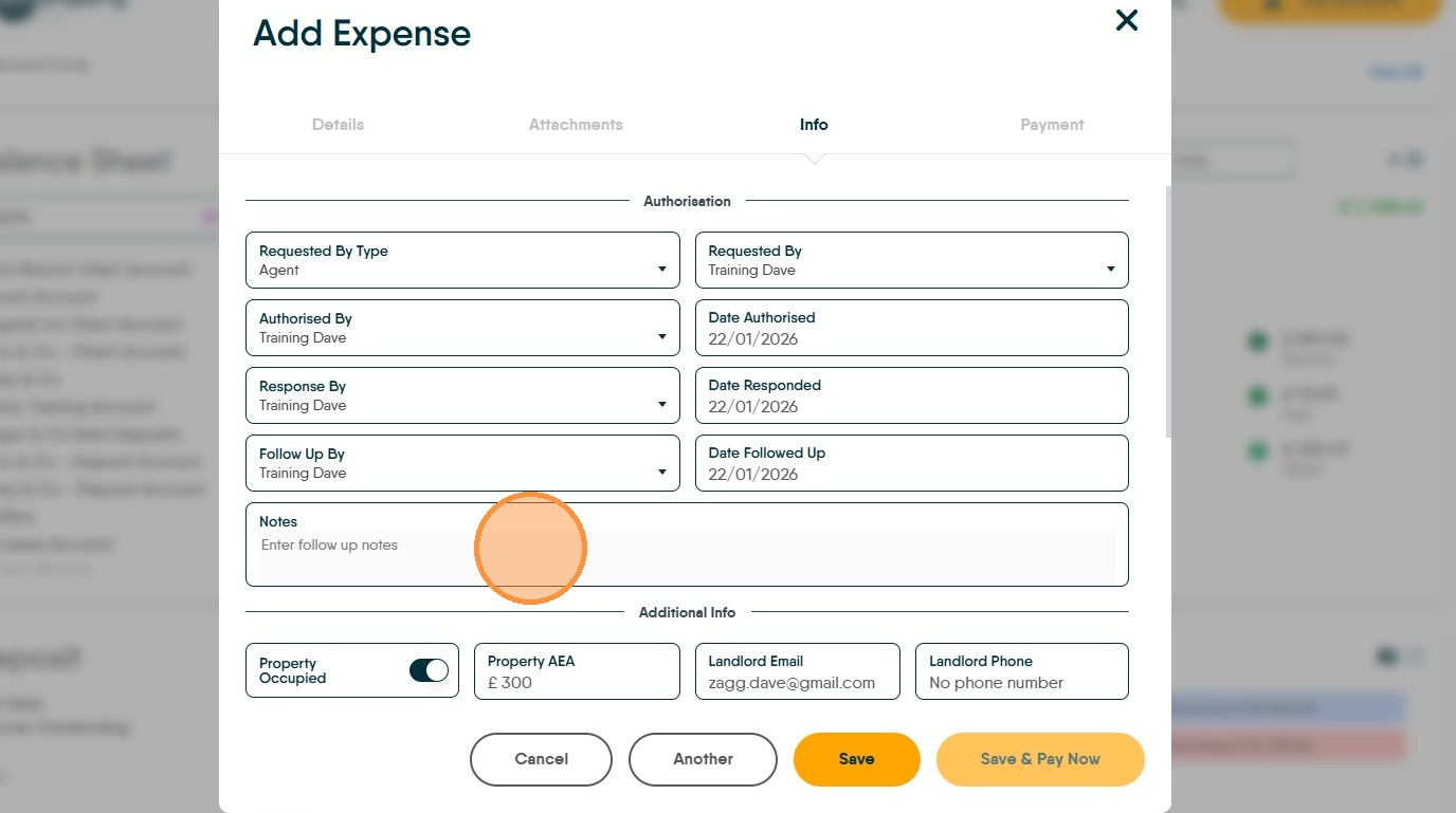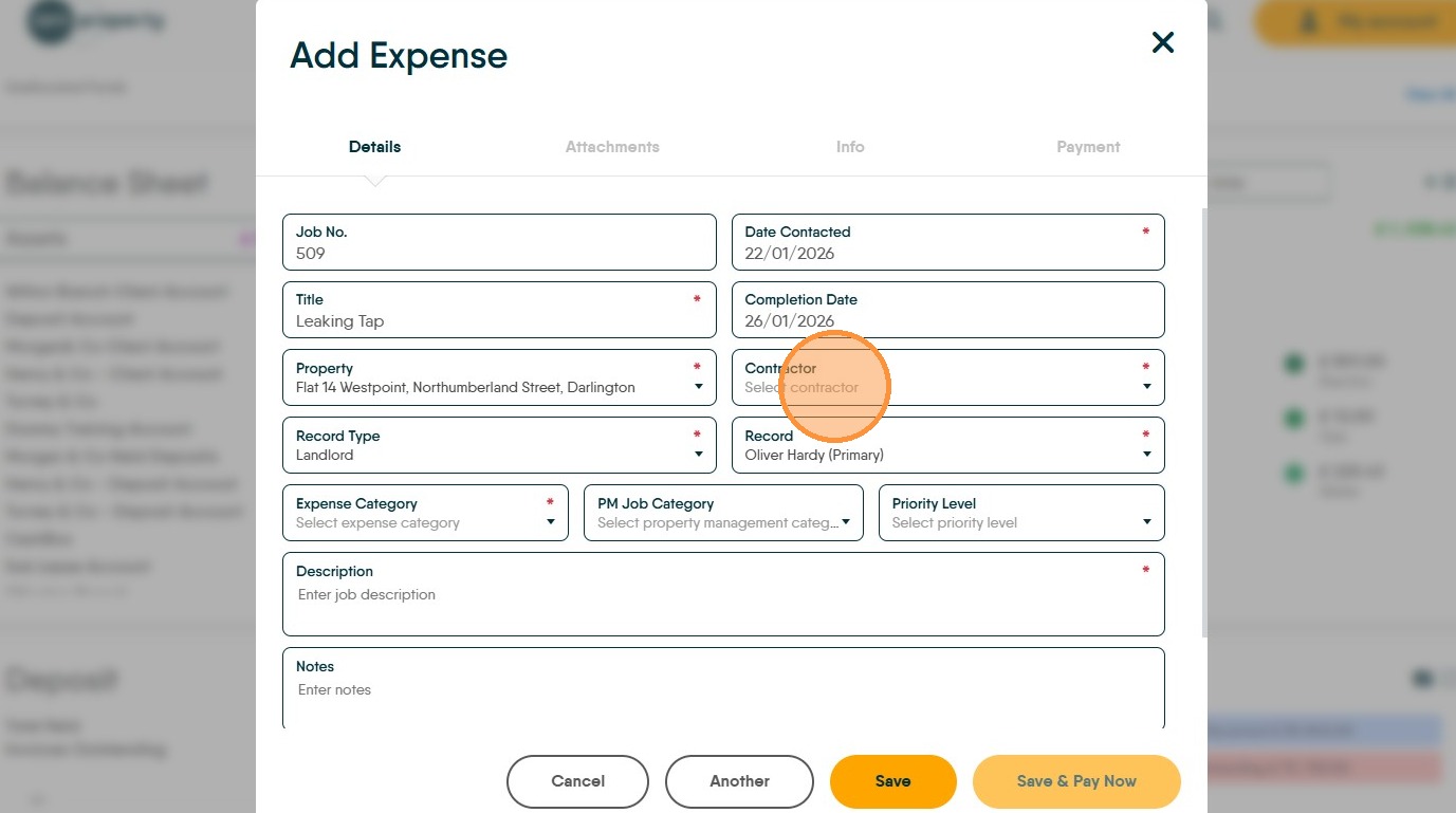 30. Click "Save" The charge will now be made to the Landlords account. The payment will be taken and the payment made to the Contractor will be made when Perform Payments is next run.