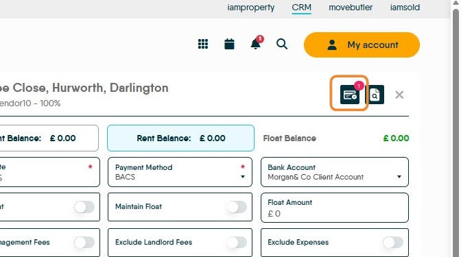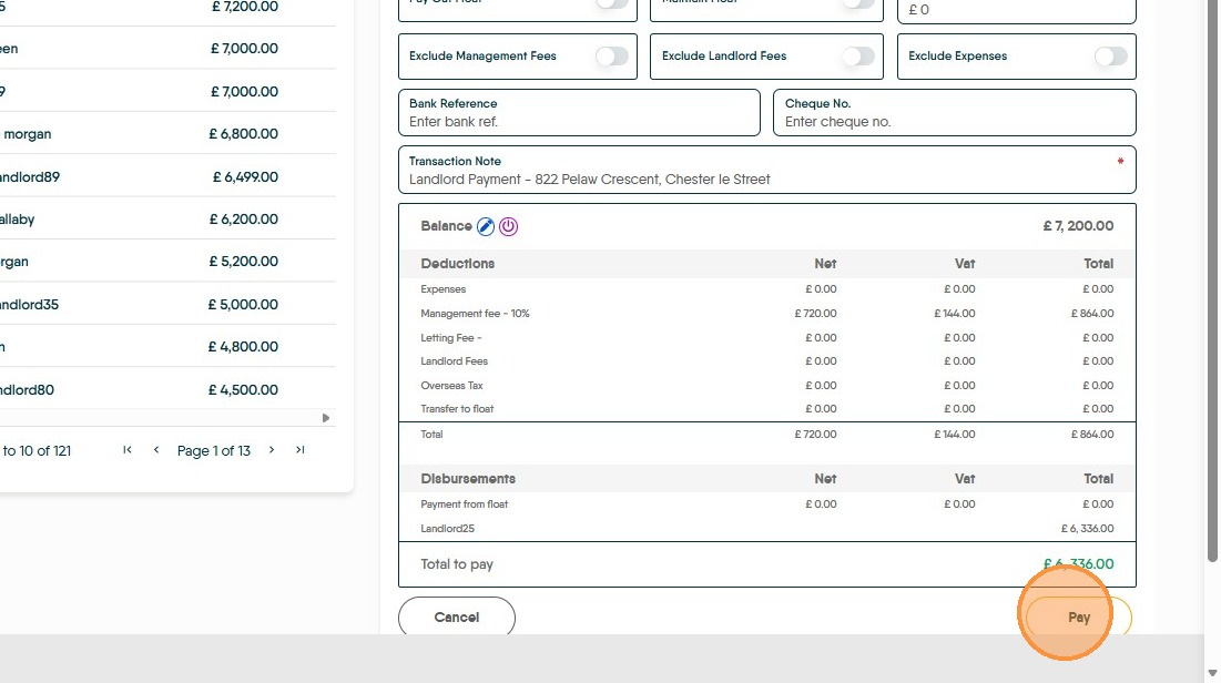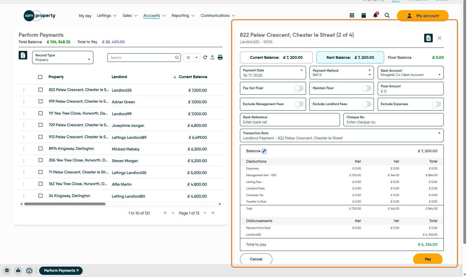 12. Clicking "Pay" will create the payment line to the Landlord and if not paid previously will create the payments to any contractors. If the payments are to be made via BACS then these will be added to your BACS list, if payments are cheque, bank transfer etc then the payment line will show in the Client Account on CRM.