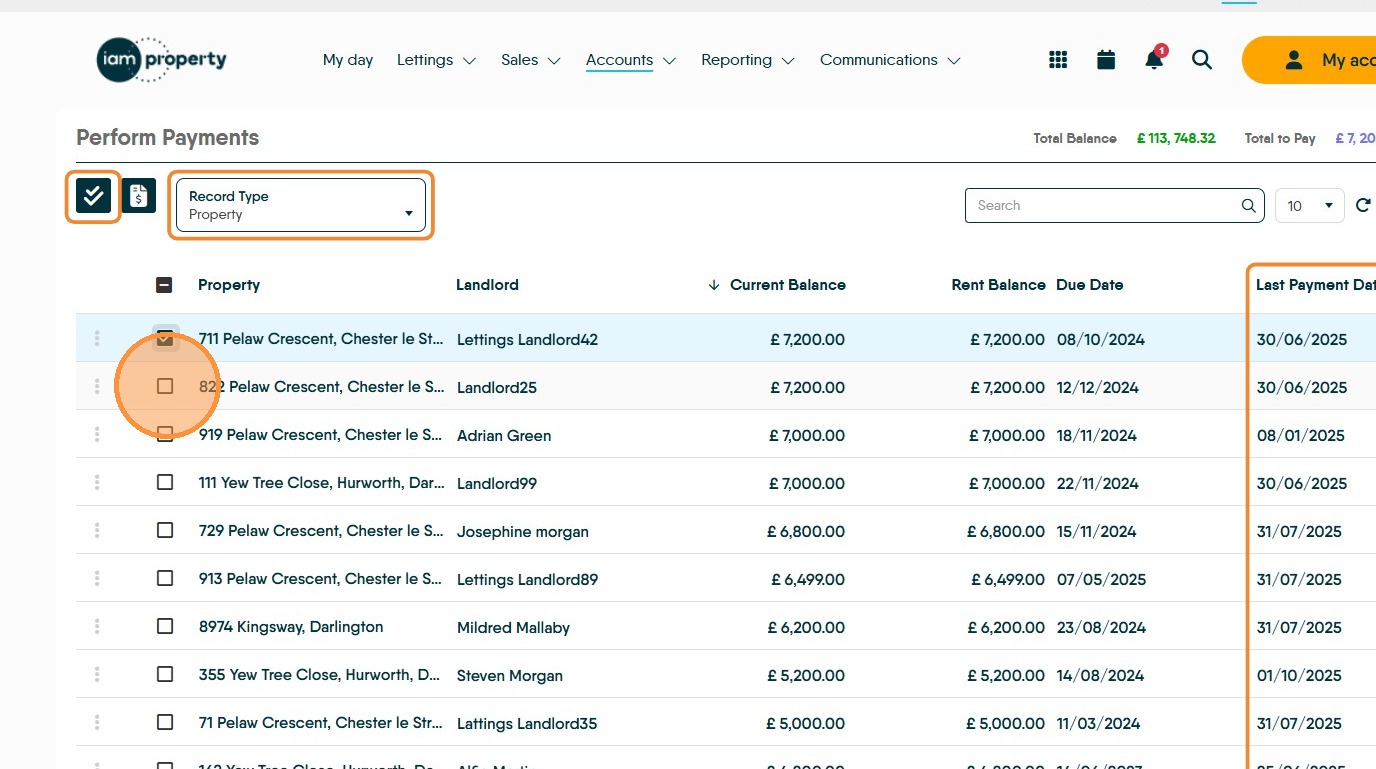 7. Click the checkbox next to the payments you wish to make. You can sort this list using the 'Record Type' option this will allow the option of a Portfolio view or a Property view (as shown). Once the Landlords you wish to pay have been selected, click the 'Pay Selected' icon ( 2ticks)