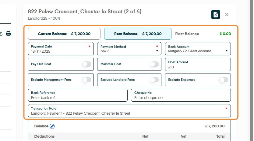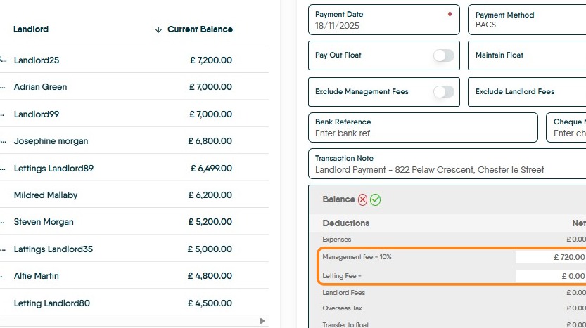 9. The top section of this screen shows information on the current balances, these are the amounts in the Landlords account before any other charges. Current Balance is any funds retained/held on the Landlords account, Rent Balance is the rent due to the Landlord (pre-expenses and fees). Also visible is the current Float balance, the float can also be managed from here. Fees and Expenses can also be excluded from here, if fees and expenses are excluded they are rolled over to the next month.