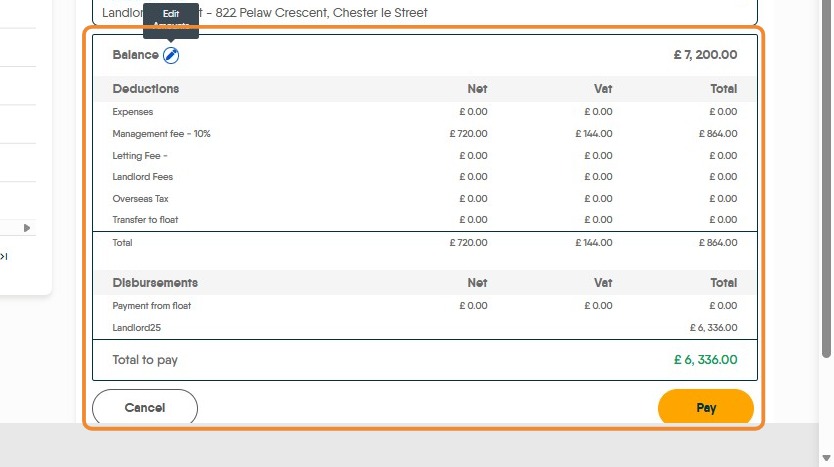 10. The bottom part of this screen shows the balances that will be charged to or paid out from you to the landlords. By clicking on the 'Edit Amounts' icon some of the balances can be edited.