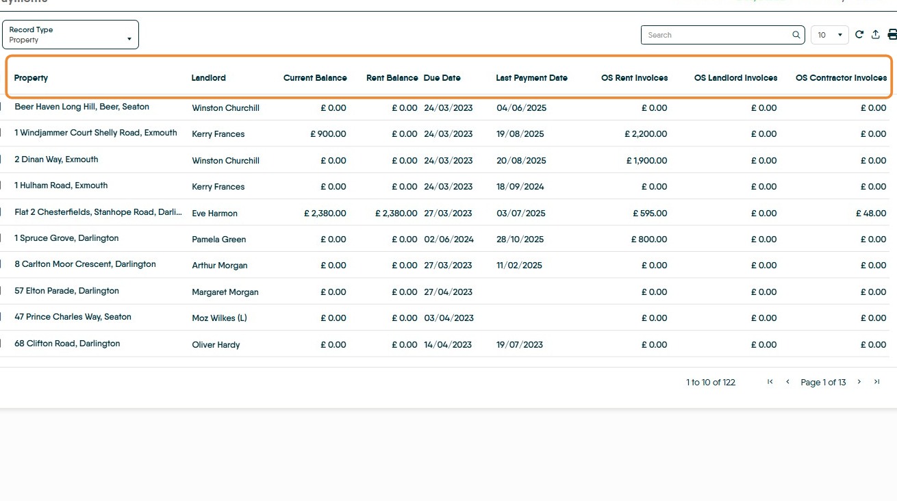 The list can also be sorted by using any of the column headers, the most useful will be 'Last Payment Date' as this shows the date the last payment was made to a Landlord. This screen can also be exported to a .csv file for reference or use in excel/sheets etc.