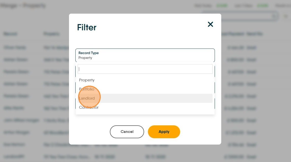 6. From the drop down menu select "Landlord" this will create a report for a specific landlord, rather than the usual setting of property which creates a report per property.