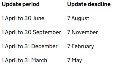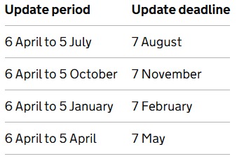 You can choose to send quarterly updates that end on the last day of month. This will make your record keeping simpler if your accounting period ends on 31 March.