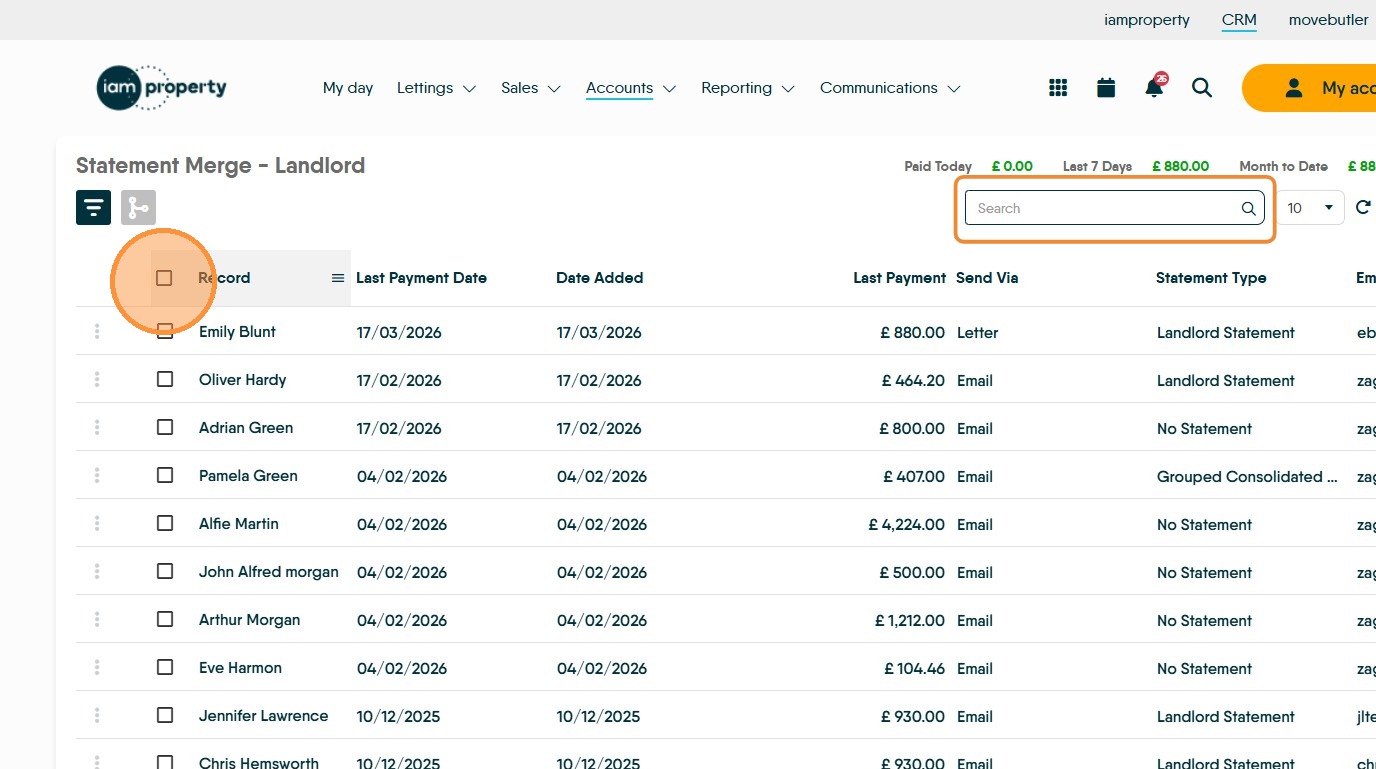 8. Click this checkbox to select all the Landlord records, or click the checkbox next to each of the Landlords you need to send a statement email to. (If you have followed our suggestion above) To sort the list to only show the Landlords requiring a Quarterly statement type 'Consolidated' into the search field