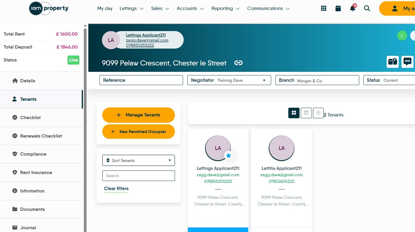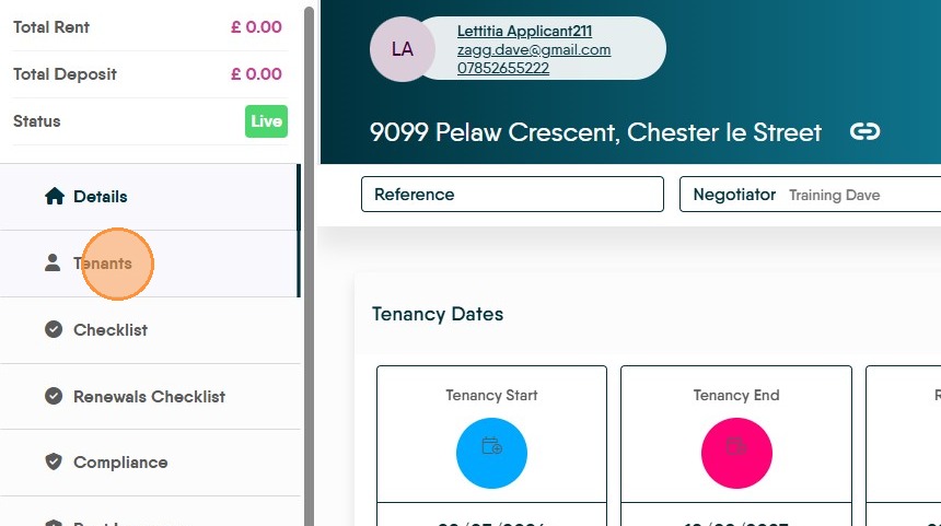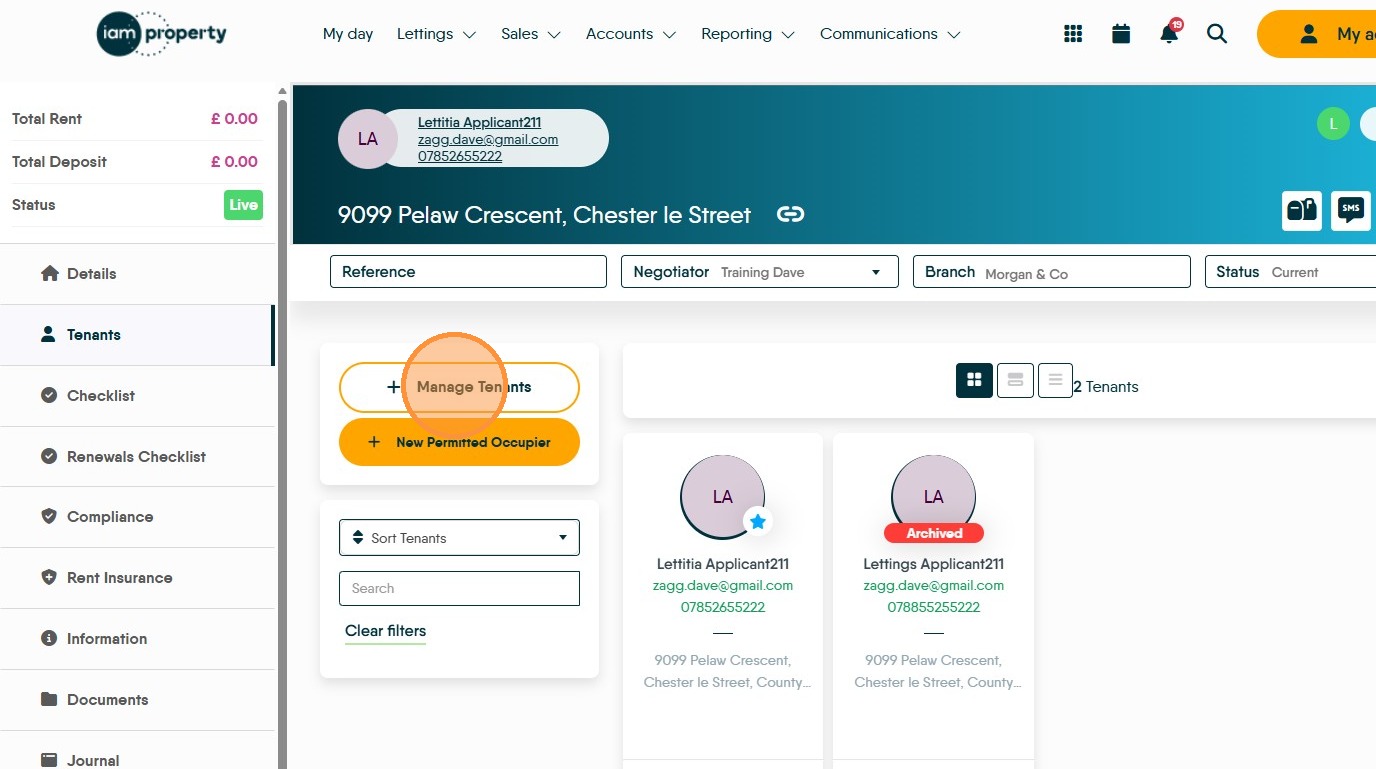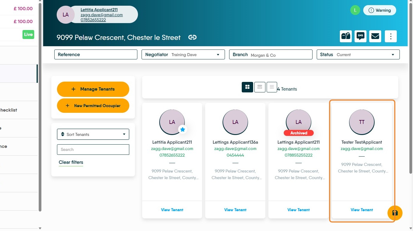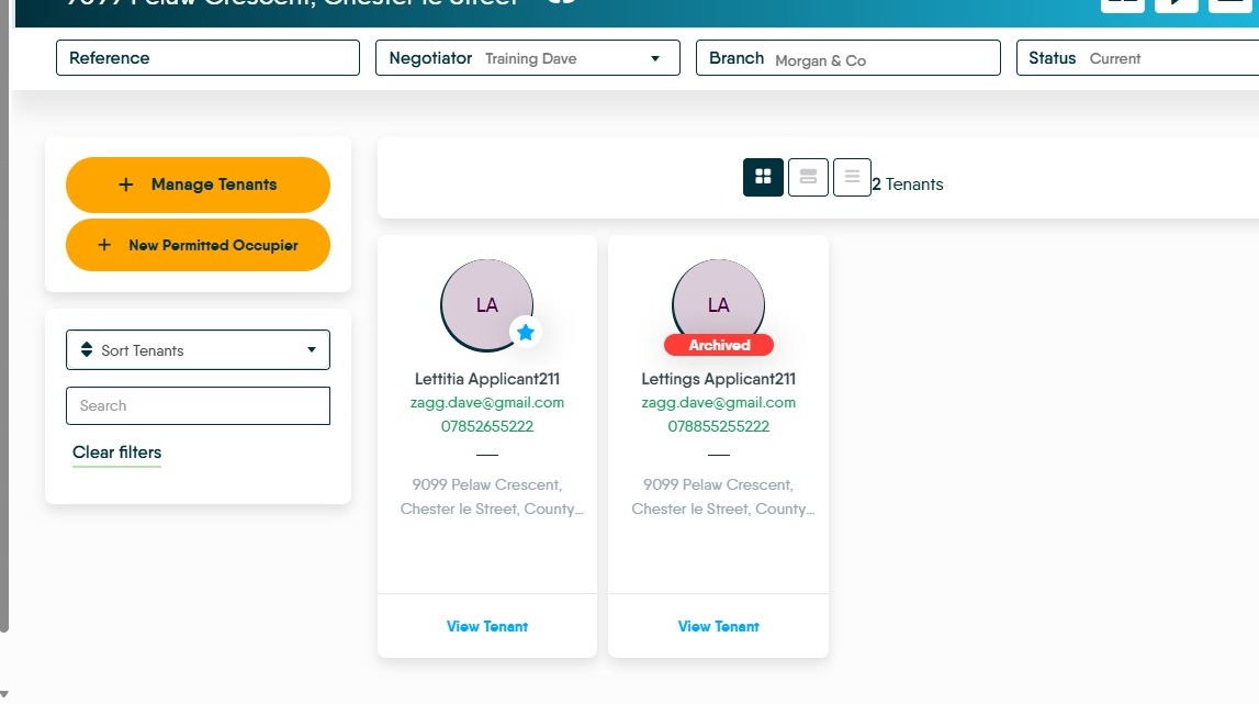 14. The Tenants will show, the primary tenant will be live and the one you have just removed from the tenancy will show as archived